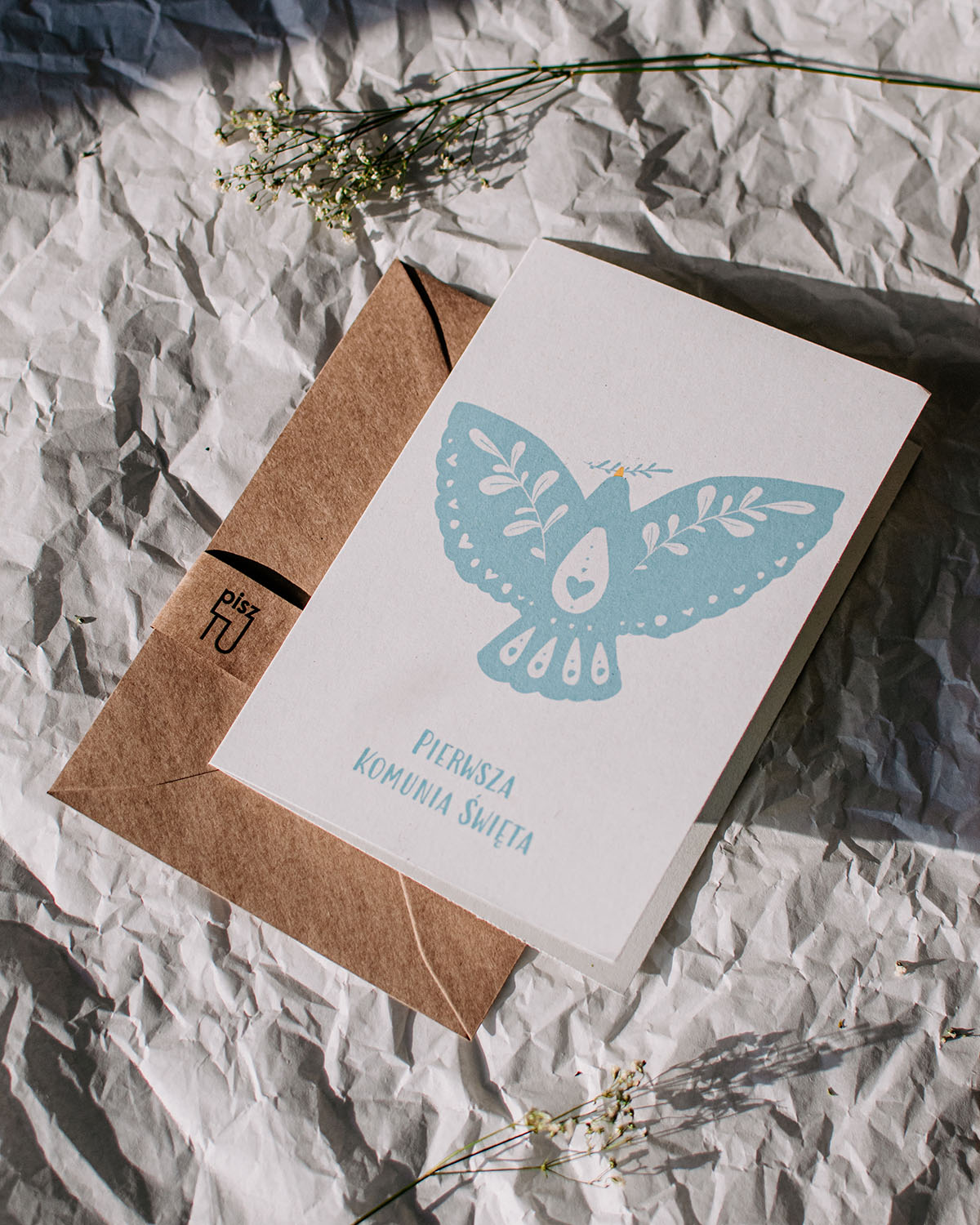 Kartka „Gołębica” to subtelna i symboliczna propozycja z autorskiej kolekcji piszTU. Stworzona z myślą o wyjątkowej chwili – I Komunii Świętej i duchowej refleksji. Delikatna grafika z niebieską gołębicą – ptakiem pokoju i czystości –  oraz subtelnym napisem sprawia, że kartka doskonale sprawdzi się jako pamiątka I Komunii Świętej.