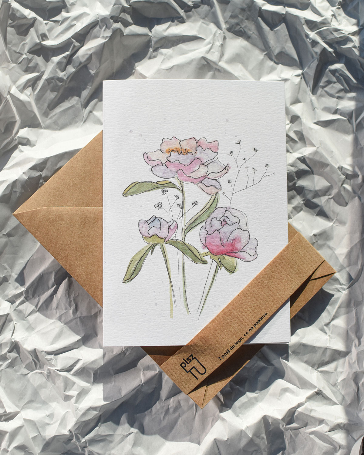 Piwonia, to jeden z najpiękniejszych symboli lata. Kartka okolicznościowa z motywem piwonii z kolekcji „Flowers” będzie idealnym upominkiem lub dodatkiem do prezentu na wiele różnych okazji – urodziny, ślub, czy rocznicę.