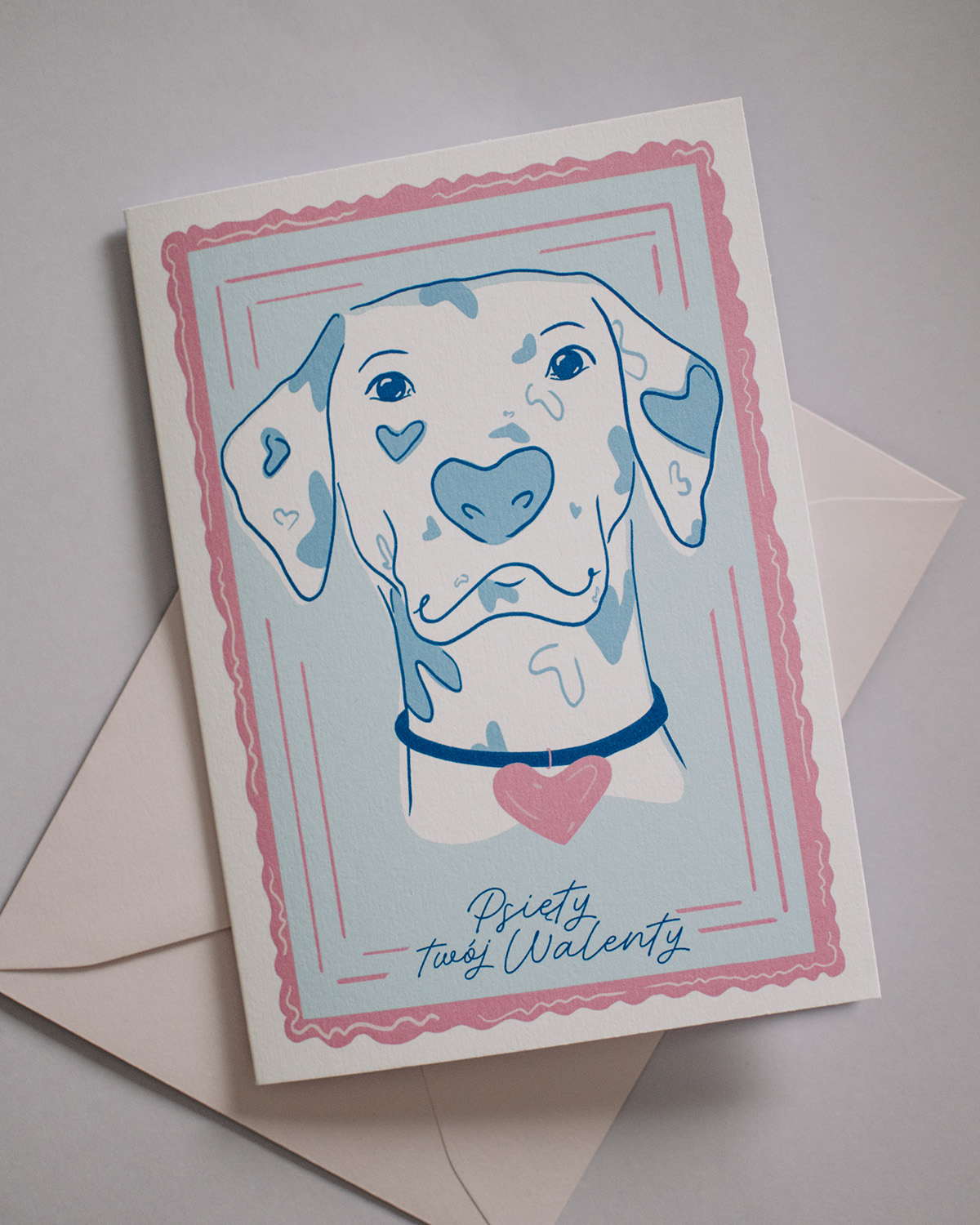 Urocza kartka walentynkowa z autorską ilustracją cyfrową przedstawiającą sercowego psa. Całość utrzymana jest w delikatnej, pastelowej palecie różu i błękitu, która nadaje kartce lekkości i ciepła.