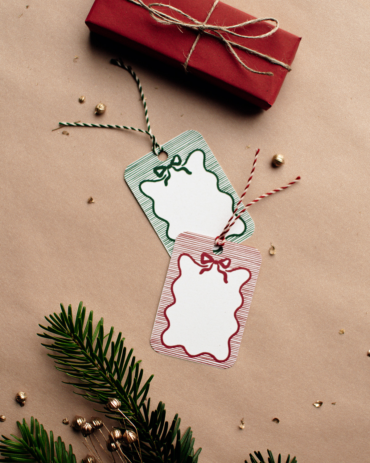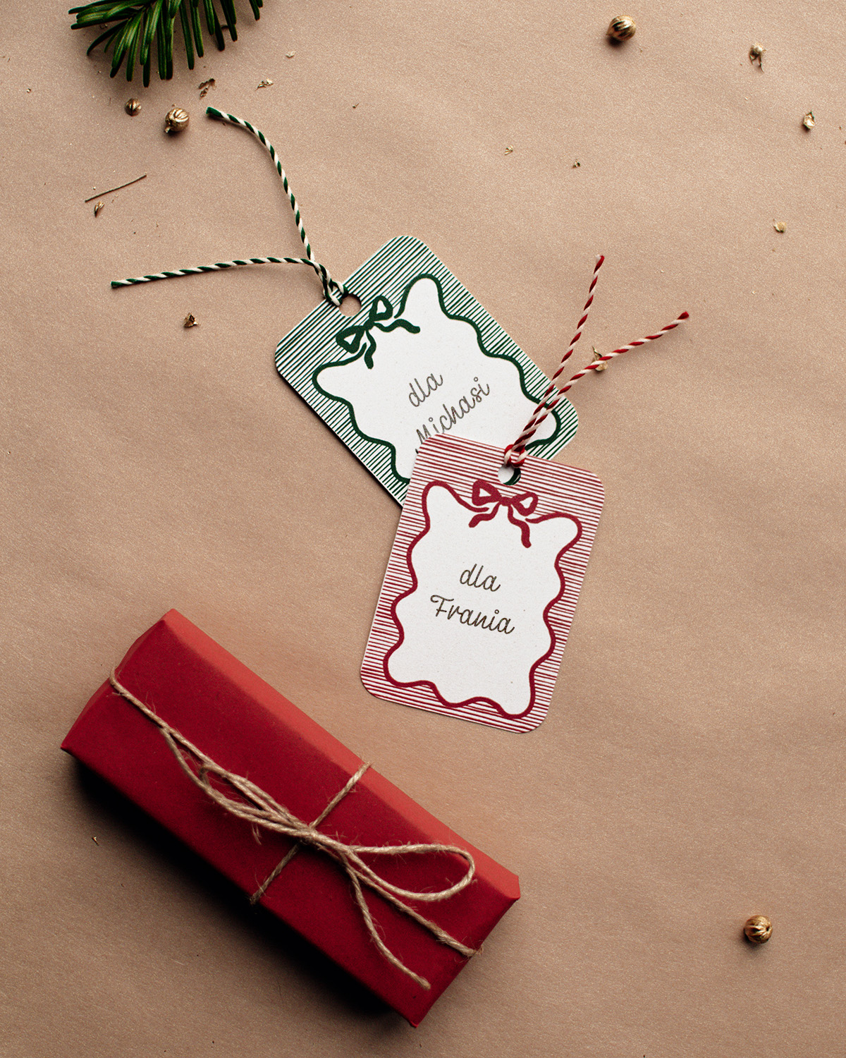 Te eleganckie etykiety prezentowe powstały jako uzupełnienie limitowanej kolekcji świątecznych kartek piszTU, stworzonej we współpracy z projektantką graficzną Aleksandrą Grandys. Choć nie zawierają ilustracji karuzeli czy kamieniczek, ich wzór, kształt, zaokrąglone rogi i dopasowana kolorystyka nawiązują do kartek z tej serii, tworząc spójny, estetyczny zestaw.